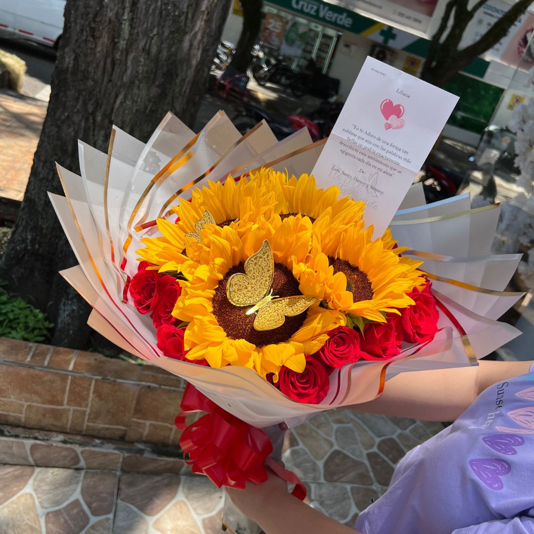 Ramo buchón con rosas y girasoles- Floristeria en cali